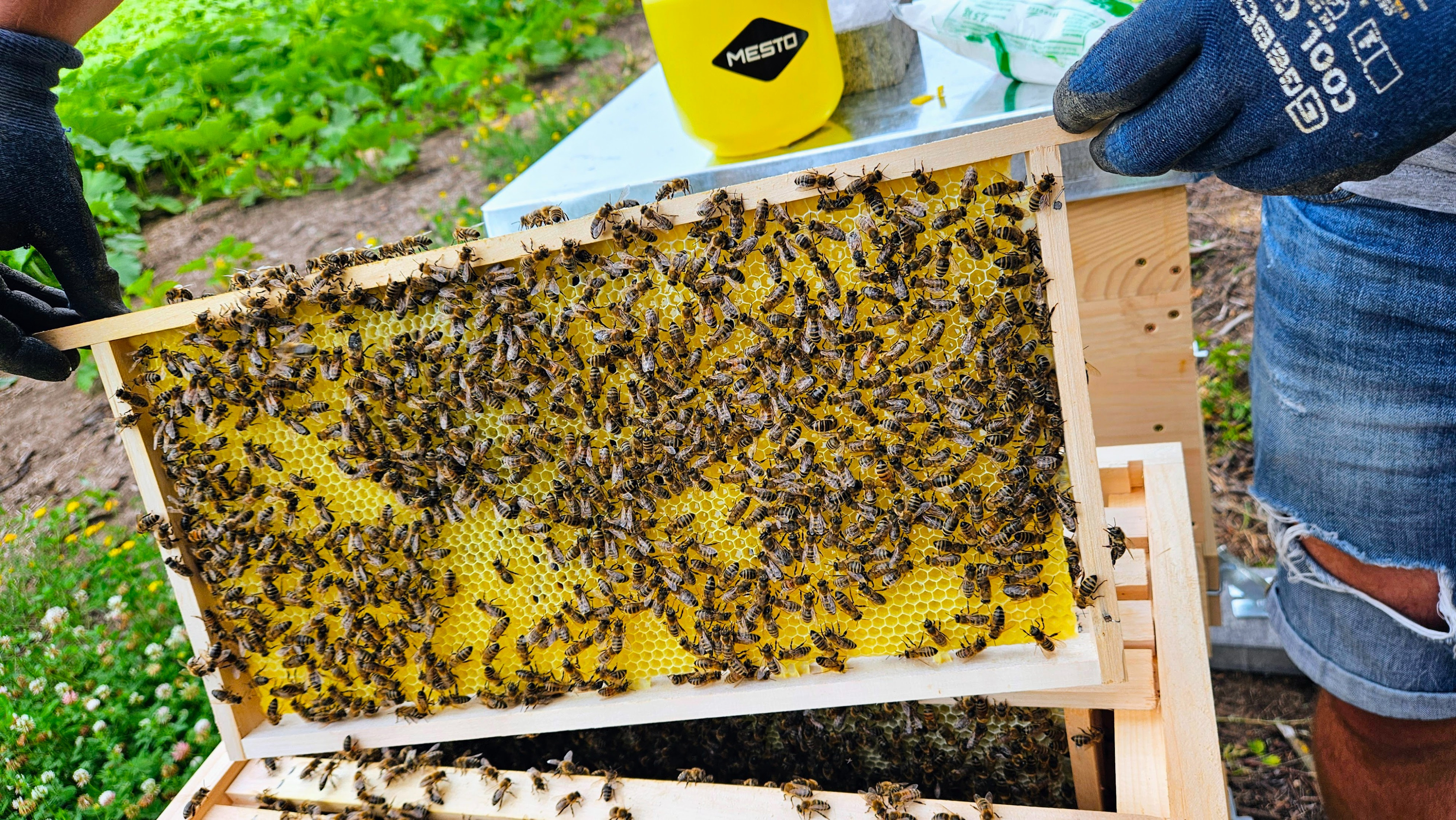 Je nach Stimmungslage, Wetter, und grundlegerer Persönlichkeit eines Volkes, sind die Bienen mehr oder weniger aggressiv und verteidigen sich gegen uns Imker, wenn wir den Stock öffnen. Natürlich gehören Stiche auch zum Imkern, aber so richtig Spaß macht uns das nicht. Um die Bienen etwas zu beruhigen beziehungsweise abzulenken, benutzen wir Rauch. Dafür geben wir trockene Pflanzenreste, Sägespäne, oder ähnliches in einen Smoker und erhitzen das, bis es zu rauchen beginnt. Für die Bienen ist der Rauch ein Zeichen, dass der Wald brennt. Als natürliche Reaktion, beginnen sie sich auf die Waben zu setzen und sich mit Honig vollzusaugen. Sie können dann nämlich bei einer eventuellen Flucht Nahrung mitnehmen. Dieser Reflex ist sehr hilfreich für uns, weil die Bienen dann eben mit Honigsaugen beschäftigt sind und sich nicht um die Eindringlinge kümmern. Wenn der Stock dann wieder verschlossen ist, und der Rauch abgezogen, lagern die Bienen den Honig einfach wieder in die Waben ein.