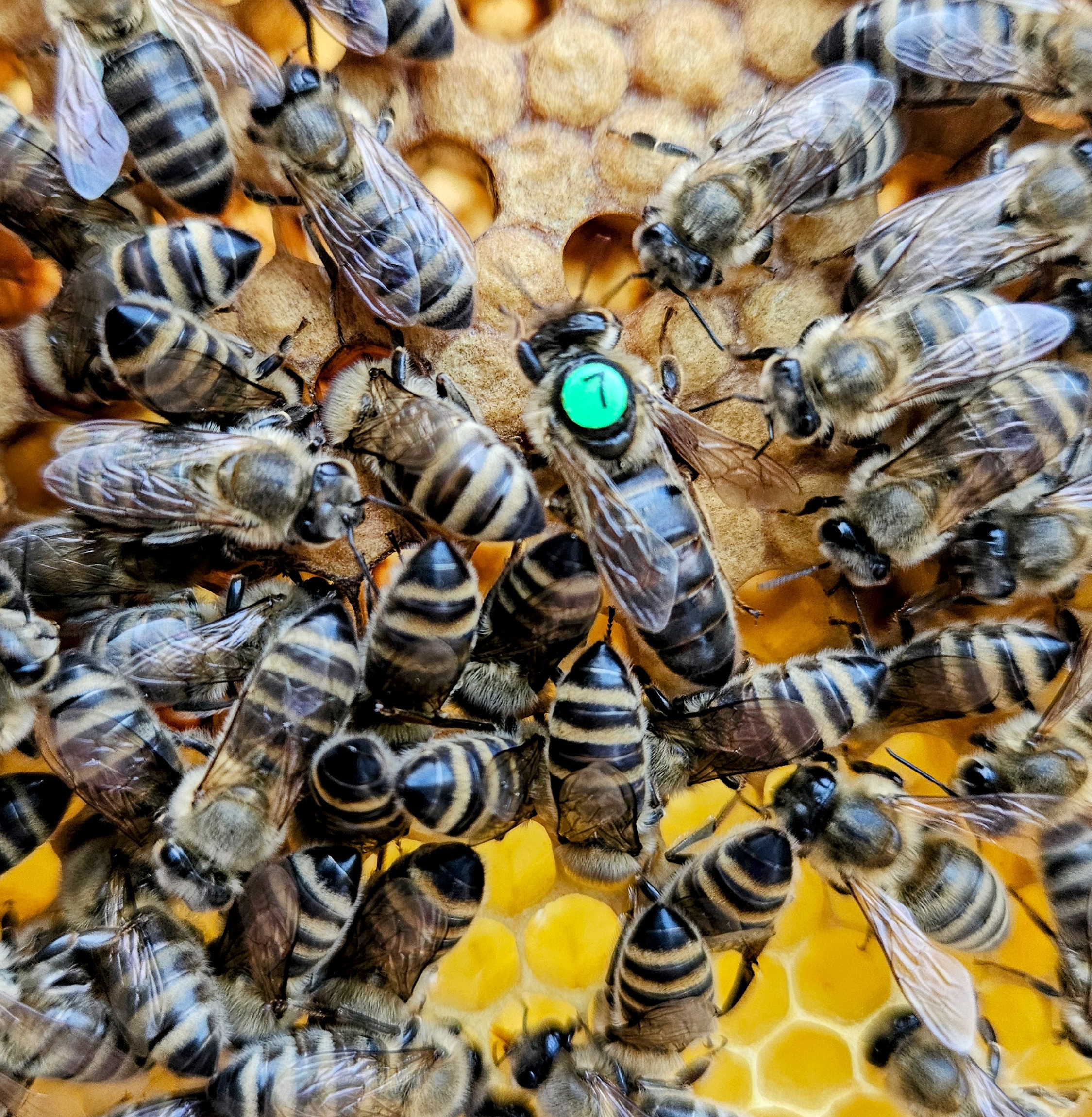 In jedem Bienenstock gibt es genau eine Königin. Ihr Name ist etwas irreführend, sie ist nämlich keine Herrscherin, sondern einfach nur eine ganz spezielle Biene. Sie ist die einzige Biene, die sowohl befruchtete als auch unbefruchtete Eier legen kann. Sie sieht deshalb auch etwas anders aus als normale Arbeiterinnen. Die Königin ist etwas größer und hat einen längeren Hinterleib. Ein Volk, das die Königin verloren hat, hat große Probleme, da es keine neuen Bienen mehr nachzüchten kann und somit innerhalb einiger Wochen aussterben würde.